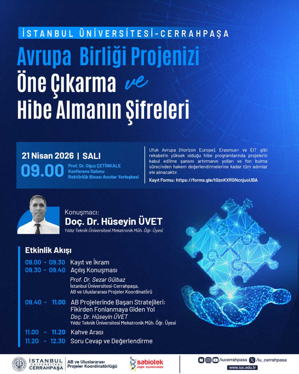 21 Nisan 2026 tarihinde, İstanbul Üniversitesi-Cerrahpaşa Avcılar Yerleşkesi Rektörlük Binası Prof. Dr. Oğuz Çetinkale Konferans Salonu’nda gerçekleştirilecek olan “Avrupa Birliği Projenizi Öne Çıkarma ve Hibe Almanın Şifreleri” başlıklı toplantımıza katılımınızdan memnuniyet duyarız.